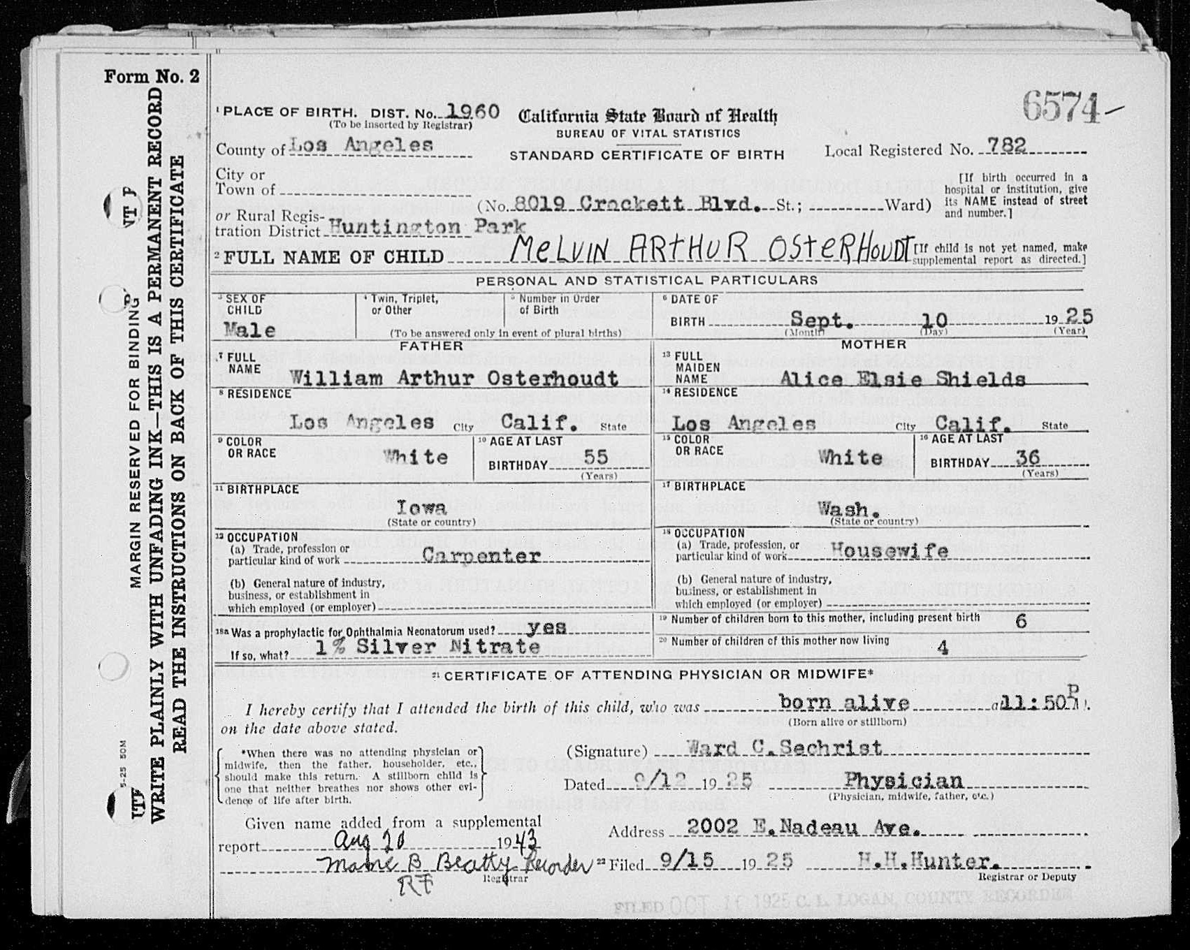 marriage (shows Elmer's address in Oakland, CA). October 6,