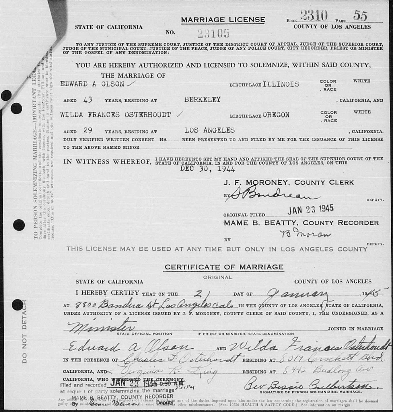 marriage (shows Elmer's address in Oakland, CA). October 6,